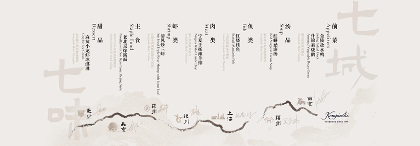凯宾斯基酒店集团携手旗下中国区七家酒店,即日起至9月19日隆重推出“七城七味”中餐厅巡礼活动。此次美食盛宴以饮食文化为纽带,贯穿南京、福州、上海、银川、苏州、北京与长沙,七家酒店中餐主厨联袂打造七道式菜单,呈现七座城市的风土人情与地道风味。