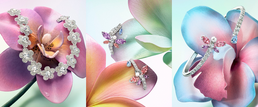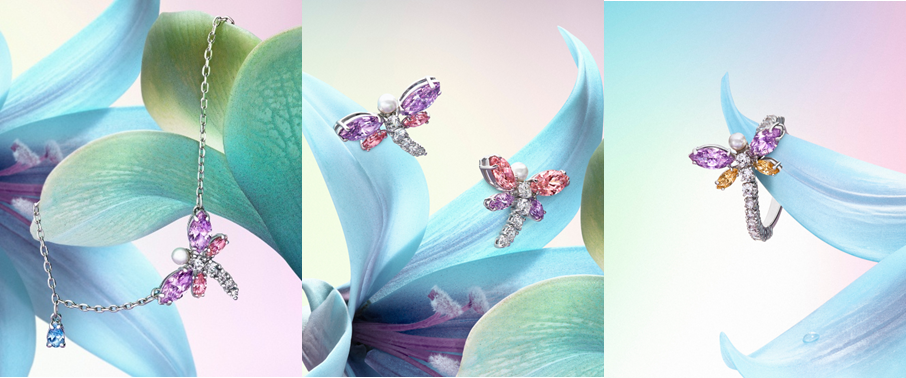 蜻蜓与花卉的具象与抽象美学交相辉映,共同谱写一曲闪耀的自然魔法赞歌。彩虹色调的宝石流光溢彩,细腻柔美的仿水晶珍珠点缀于多种切割工艺与混合镶嵌的珠宝之上,仿水晶蝴蝶则翩然栖息于胸针、发饰与精致摆件间。