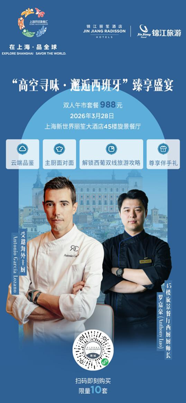 酒店限量发售10套 “旋景餐厅高空寻味·邂逅西班牙臻品双人套餐”。该菜单由Antonio与上海新世界丽笙大酒店45楼旋景餐厅西厨厨师长罗嘉豪共同打造,在西班牙经典风味基础上,结合当季食材与本地饮食偏好进行调整与呈现,在保留风味特征的同时,也更贴近本地食客的用餐习惯。宾客不仅可以在活动现场品鉴这套主题菜单,还将参与围绕西班牙饮食文化展开的分享与交流,使餐饮体验从单纯的感官享受升华为立体的文化感知。
