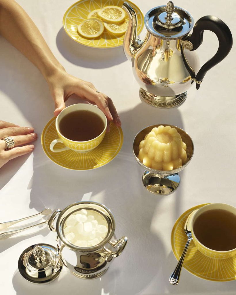 镀银餐桌珍品,从餐巾环、刀架、席位卡夹到杯垫,为马勒梅松银器系列画龙点睛。瓷器的深邃明黄与银器的璀璨光泽交相辉映,营造出明亮动人的装饰对话。
