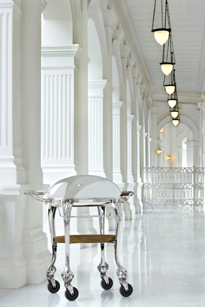 - Boeuf aux Sept Poivres 1887 由修复后的典藏银质餐车隆重呈现。这辆满载传奇的复古餐车,复刻了维多利亚时期席前切肉的用餐传统,也早已成为莱佛士餐饮体系中的标志性一环。第二次世界大战期间,餐车曾被掩埋于酒店庭院之中以避战火,战后重新出土并被修复。如今,它仍在正式用餐空间中使用,将这一餐桌仪式延续至今。