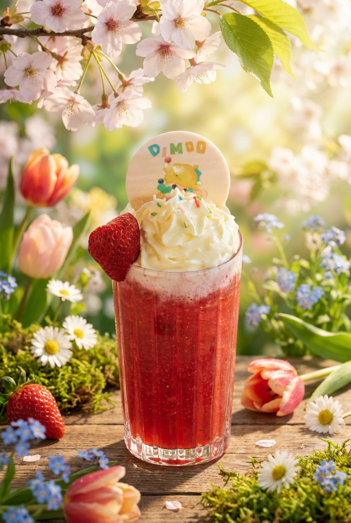 以春日鲜莓为灵感,粉润冰沙绵密细腻,顶覆蓬松奶油与整颗红颜草莓,和 DIMOO 一起“接住春天“,入口是草莓的清甜,奶油绵柔与果香交织,满溢春日鲜活气息。