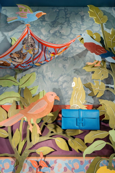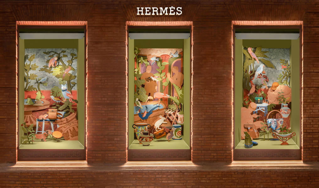 驻足于上海“ 爱马仕之家 ”的入口,本次秋季橱窗为这座建筑带来一场自然与人文的对话。暖意笼罩在男性世界橱窗里,鸟儿们注视着爱马仕大地香水或皮制挂件等精巧单品,恰如自然与人之间本真的联结。配饰橱窗妙趣横生,动物与石像化身默默守护餐瓷、靠枕等物件的护卫。它们流露的孩童意趣,让纯粹与艺思在此交织,将空间化作满溢惊奇的秘境。女性世界橱窗则流淌着优雅的韵律,一尊女神般的身影与系戴各色不一丝巾的雀鸟们相映成趣,开启一段女性气质与自然间的温柔对话,神韵和诗意对照互补。
